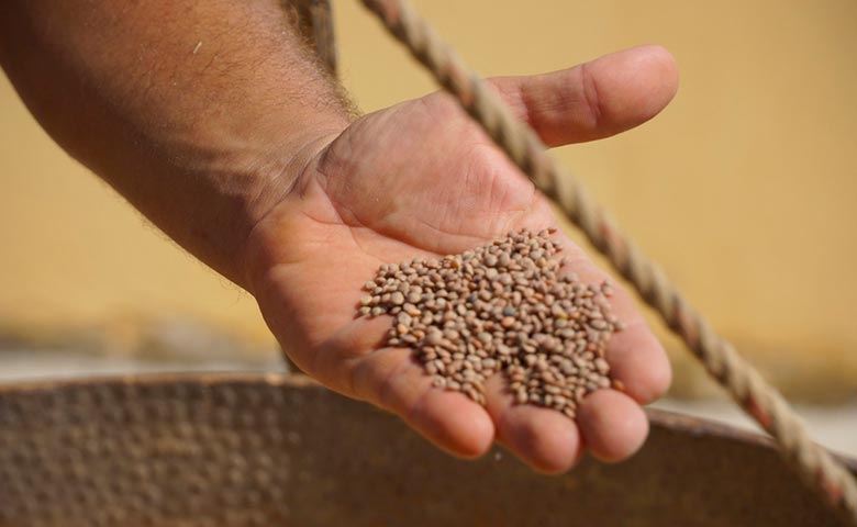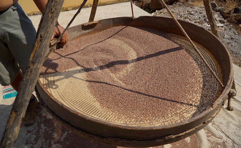 Lui, come al tempo dei coloni, ha ricevuto la sua particella di terreno e quella bustina di semi, tramandata da generazioni, che oggi si traduce nel campione più uniforme tra i frutti raccolti l'anno precedente per essere seminato l'anno successivo. Qui nella bocca del vulcano spento, i terreni sono neri e privi di ogni contaminazione, non si usano diserbanti nè concime inorganico, ecco perché i legumi raggiungono un livello di qualità impensabile in altri luoghi. Quando si dice che non c'è innovazione se non sai guardarti indietro.